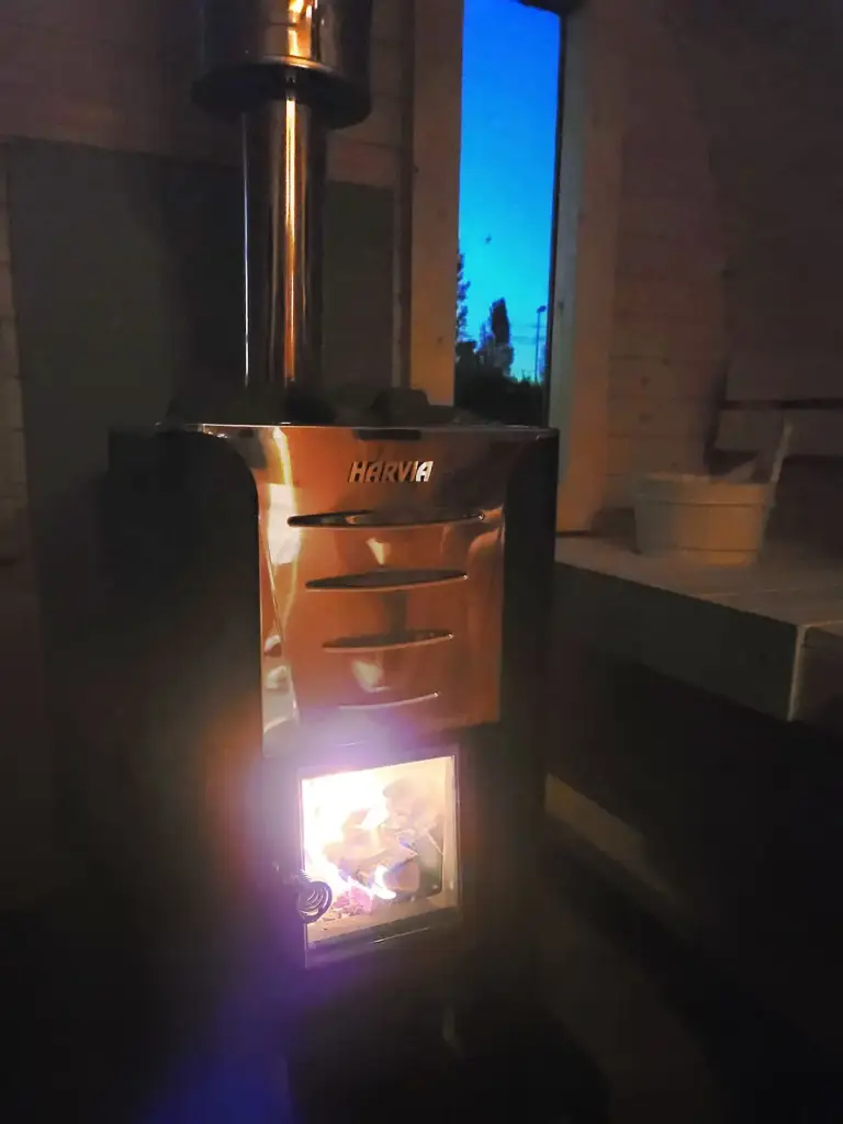- Für die erstmalige Befeuerung wird der Ofen bis zur Hälfte mit Holzscheiten gefüllt. Sobald eine Temperatur von ca. 60-80 Grad erreicht ist, kann man 1-2 Holzscheite nachlegen. Der Vorgang wird wiederholt, bis die gewünschte Saunatemperatur (70 – 100°C) erreicht ist.